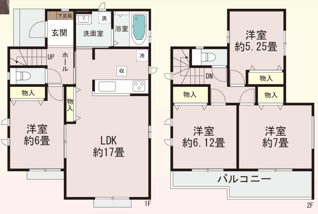 | 間取内容 | LDK 17畳 1階 洋室 6畳 1階 洋室 7畳 2階 洋室 6.12畳 2階 洋室 5.25畳 2階 | ||